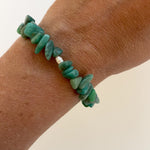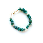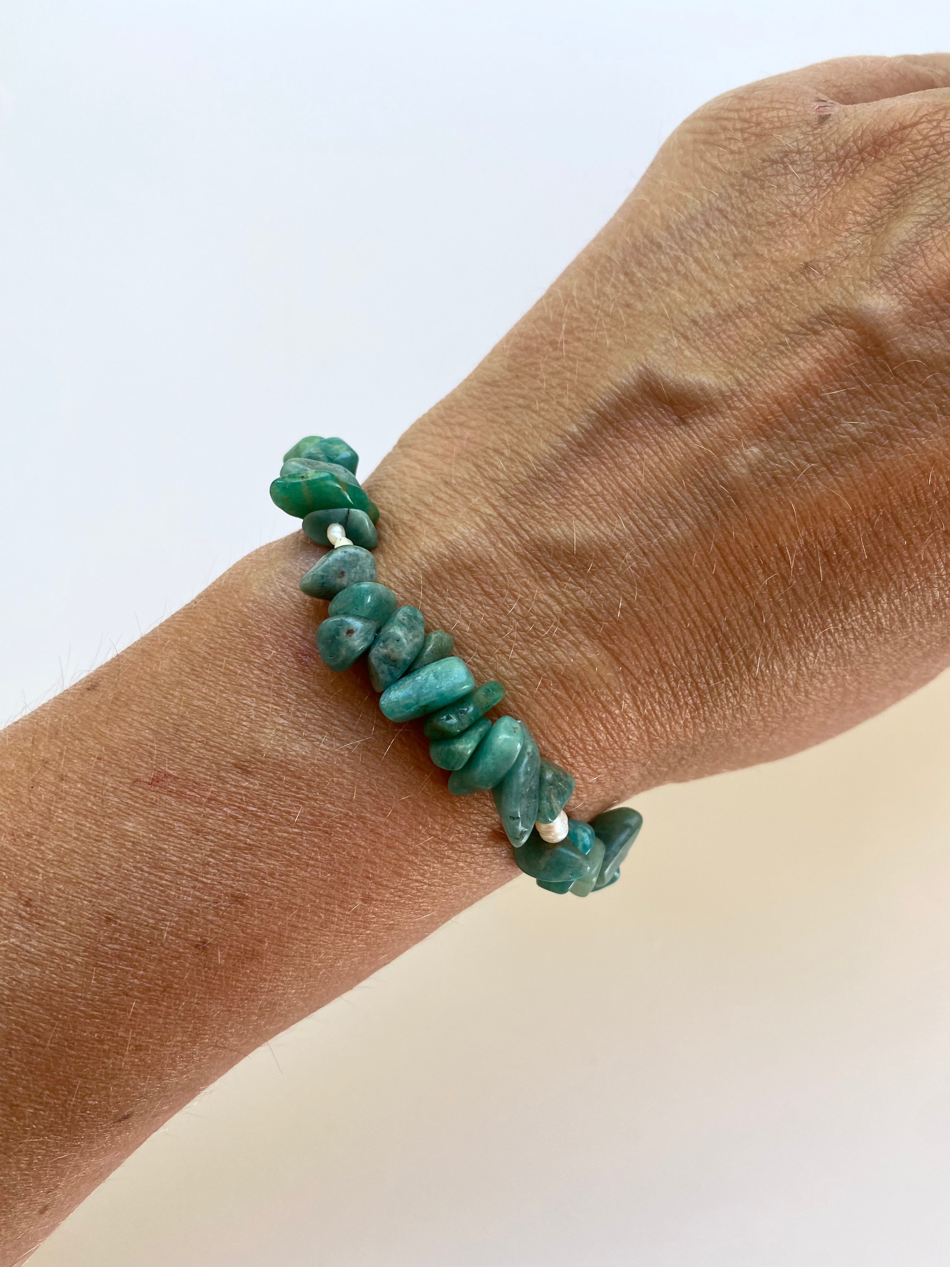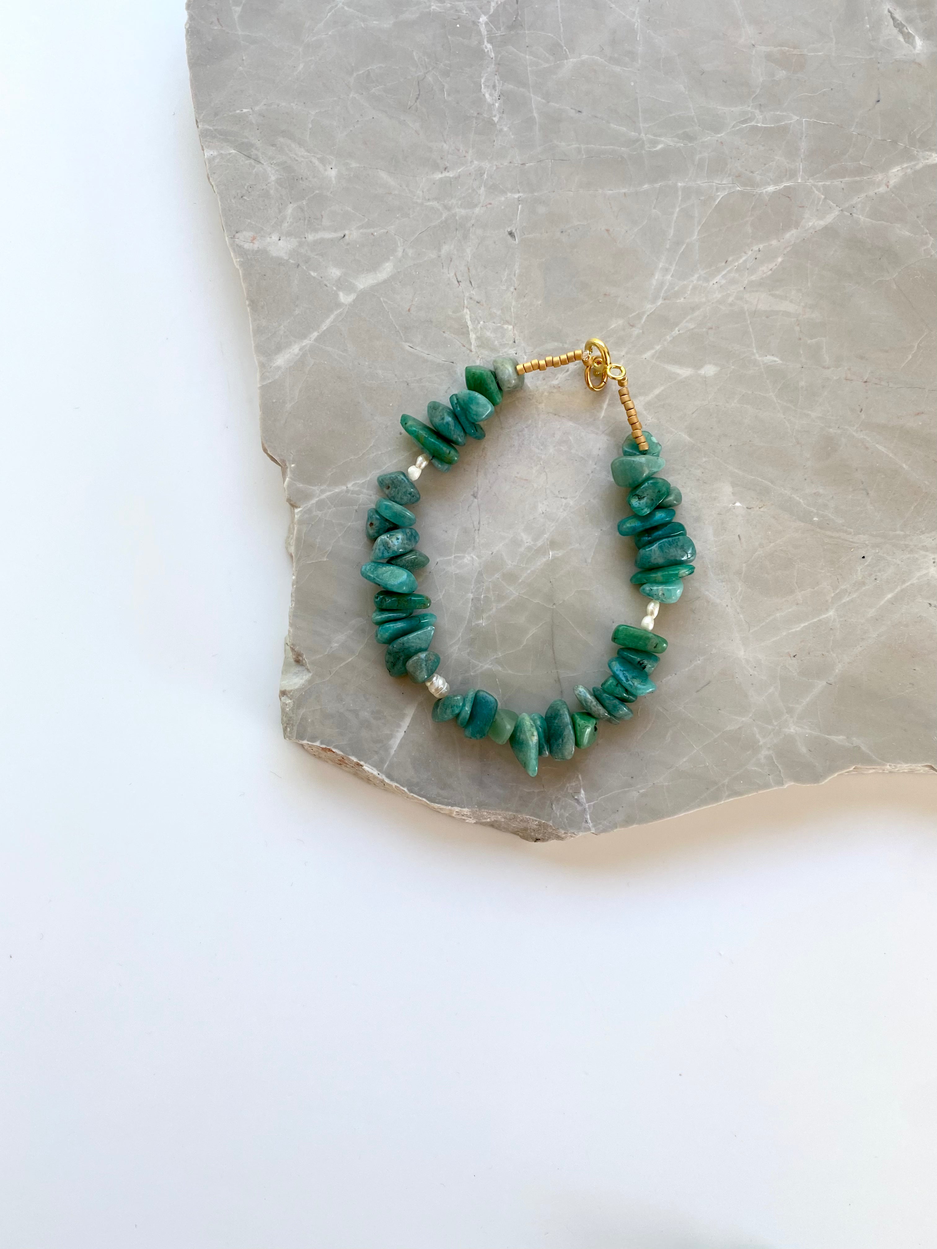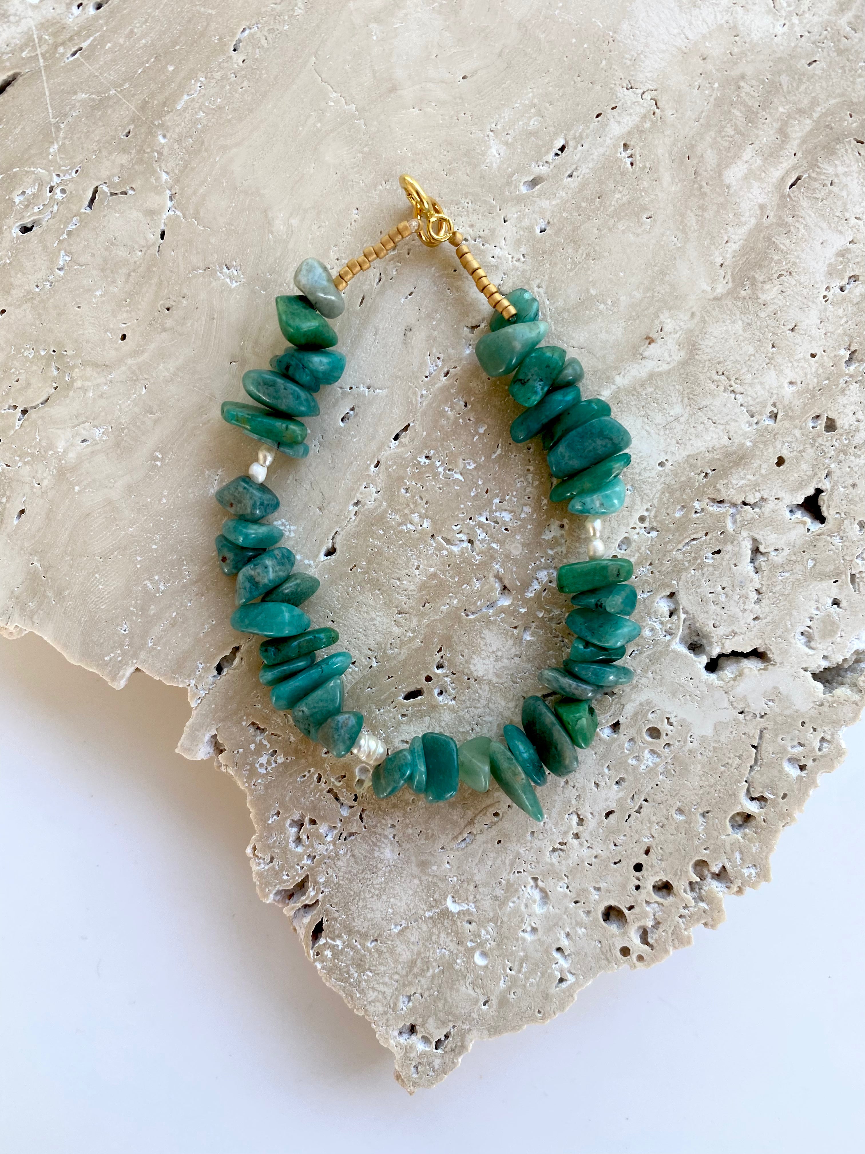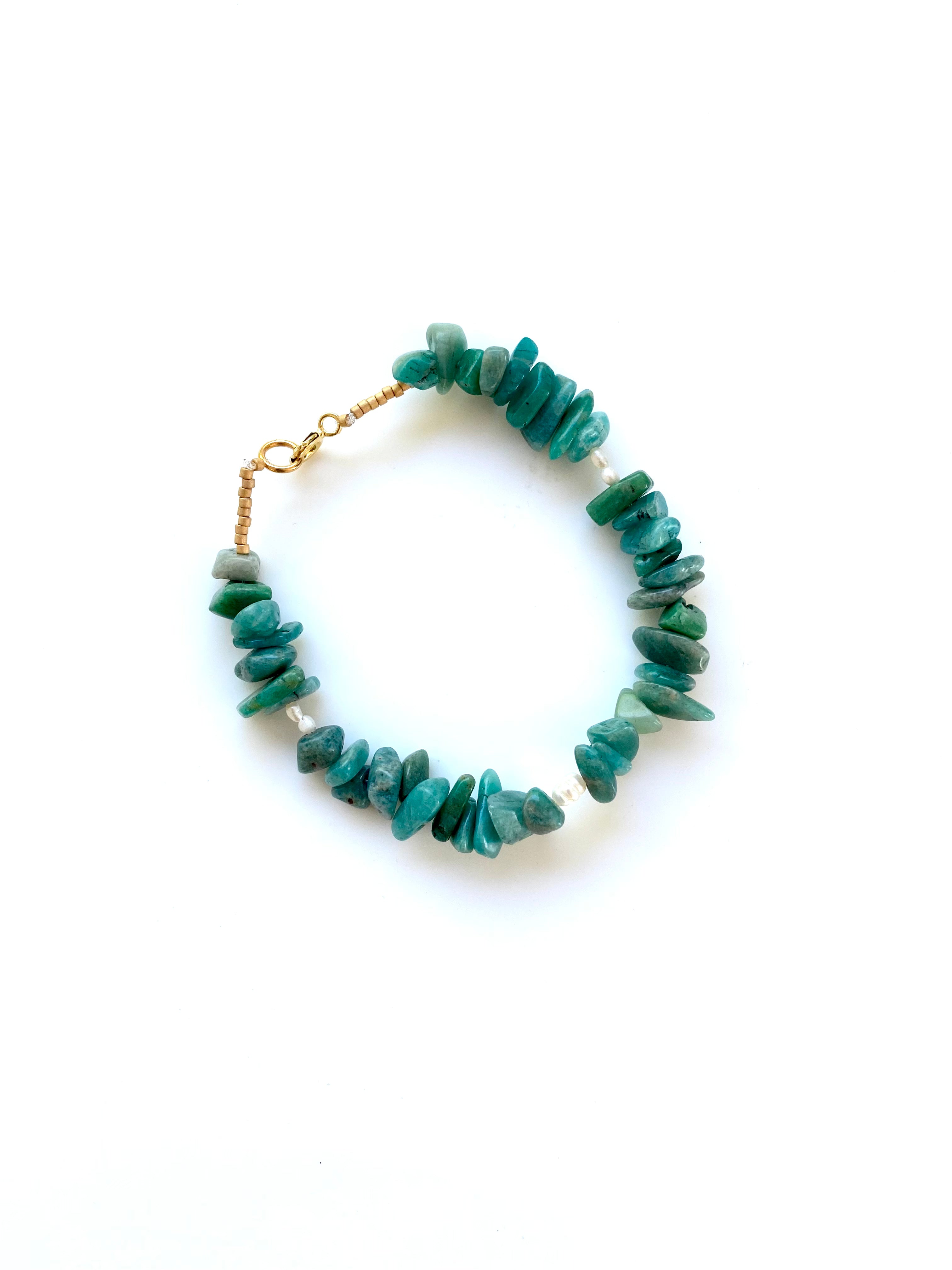 This unique bracelet is made in the gemstone amazonite, which have the most amazing combination of green colour shades, combined with a few small baroque freshwater pearls.