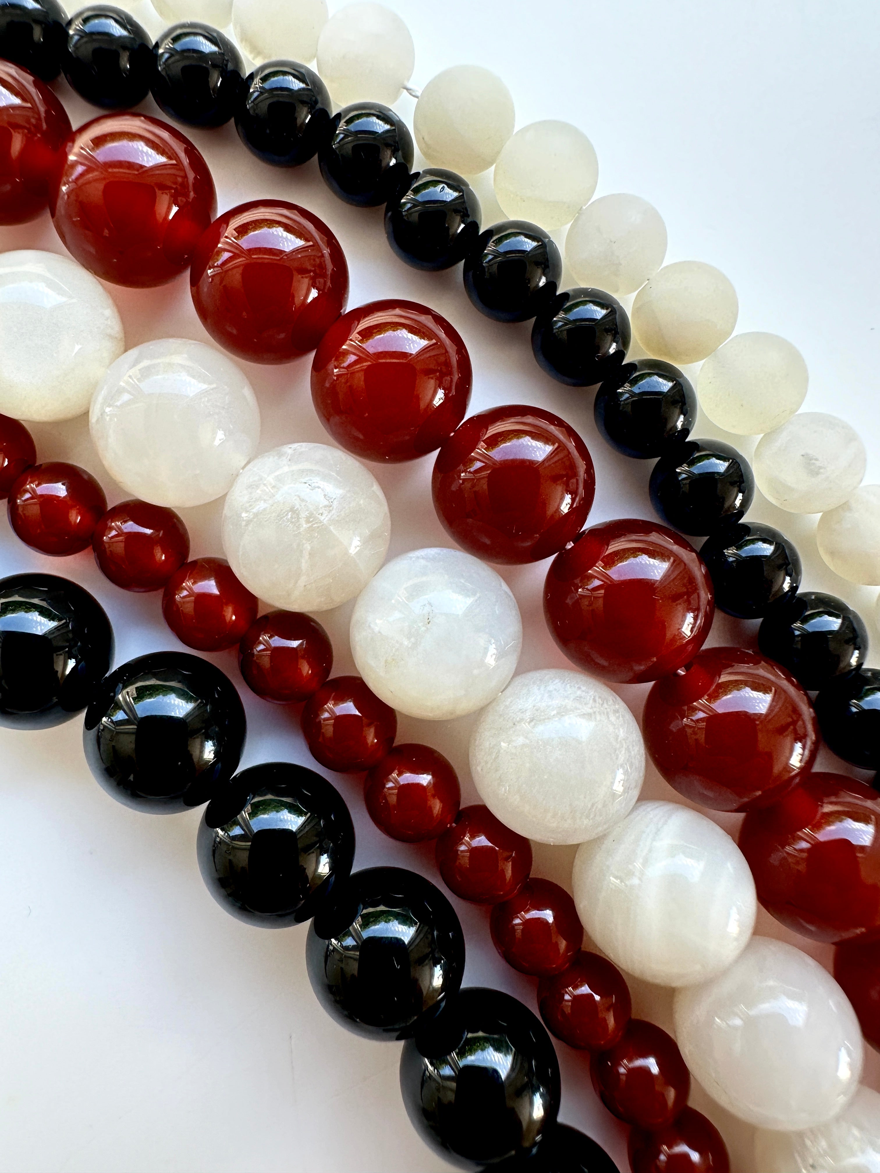 It features an array of exclusive dark red carnelian stones, elegant black onyx stones, and luxurious moonstones in various sizes. Mix and match to create your own unique and exclusive look.
