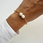 This distinctive bracelet features a bold oblong anchor chain paired with two chunky metal balls and a smaller ball at the end for a refined touch. It's an ideal statement piece for any occasion.