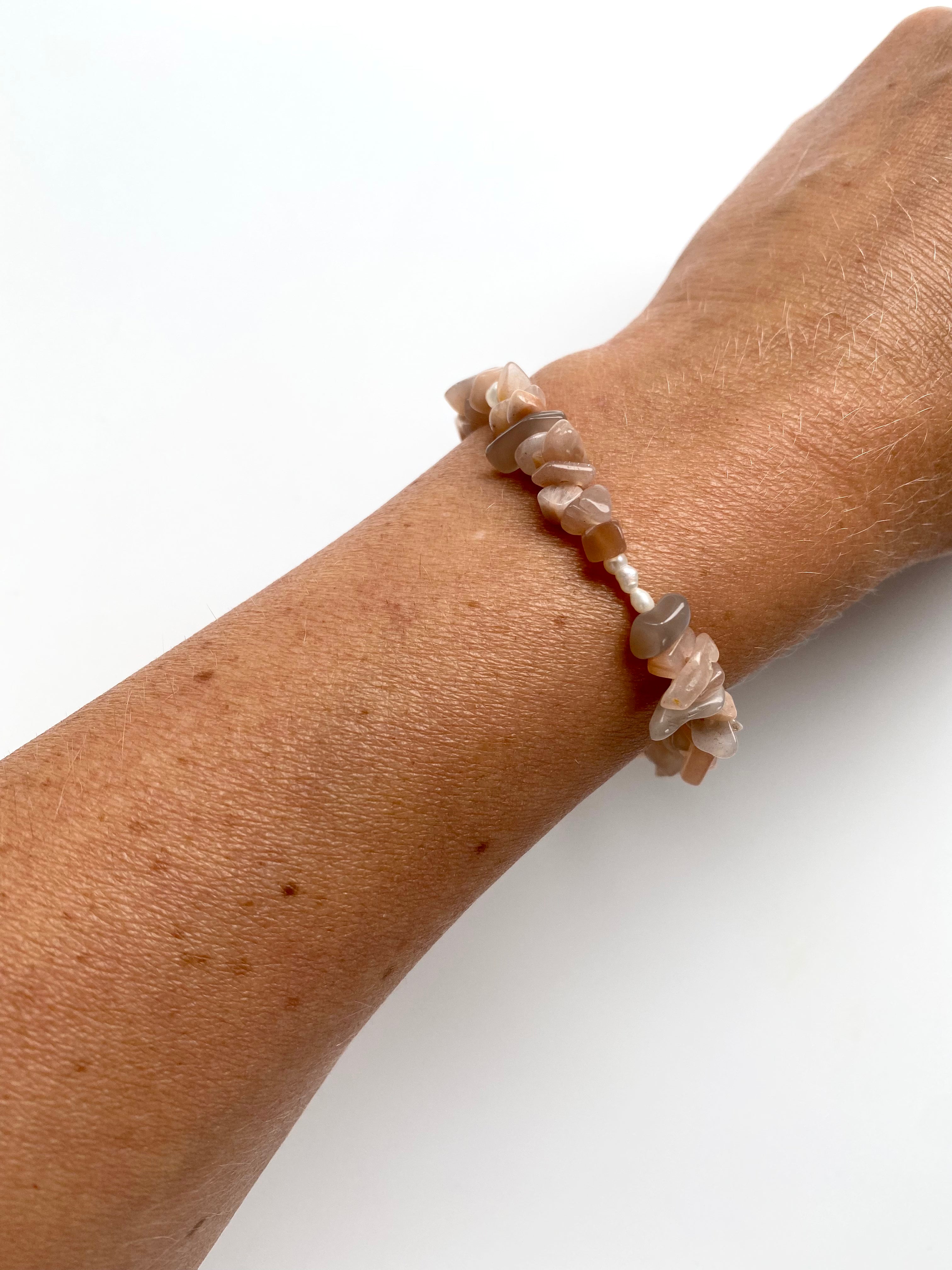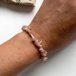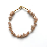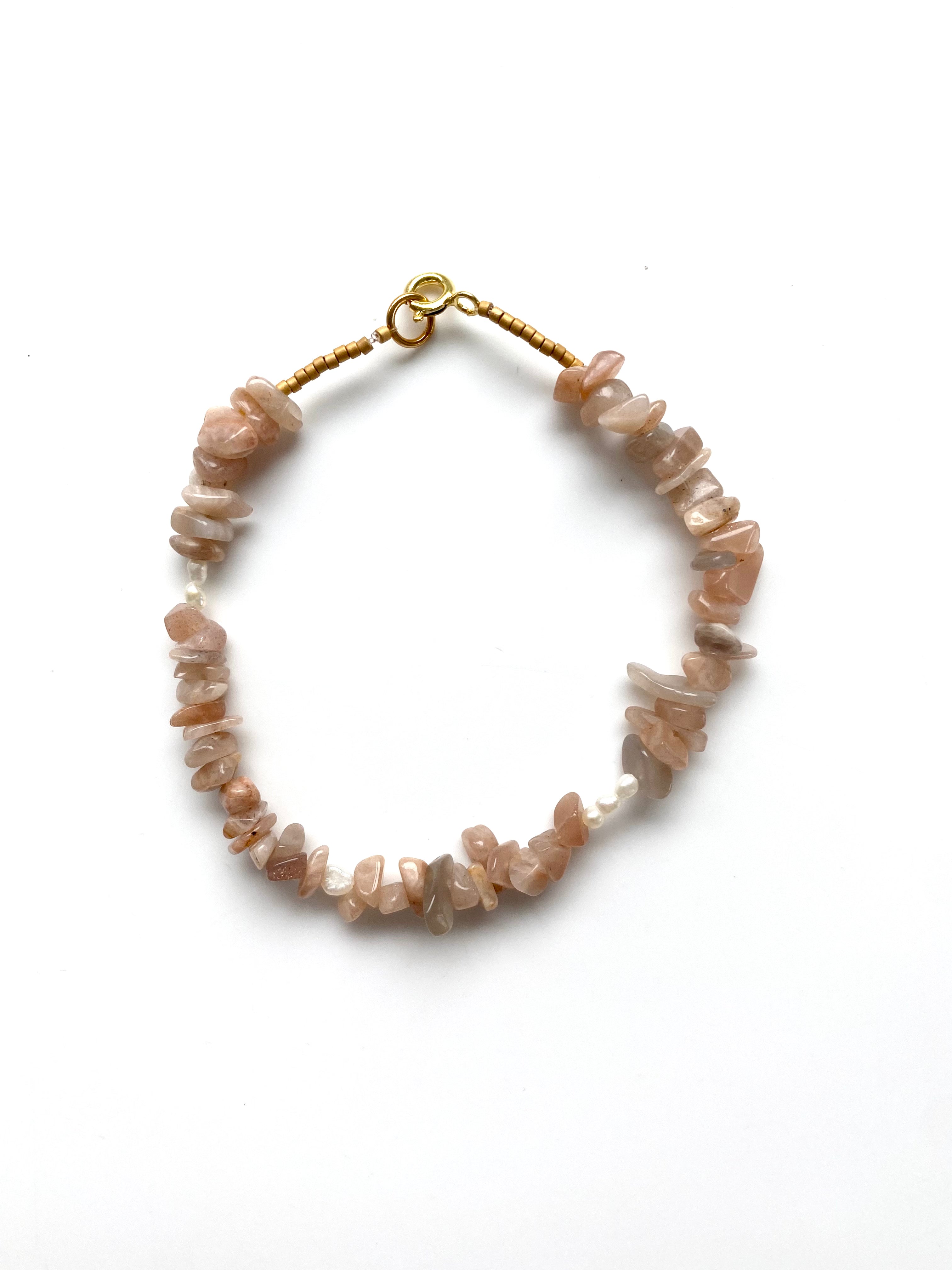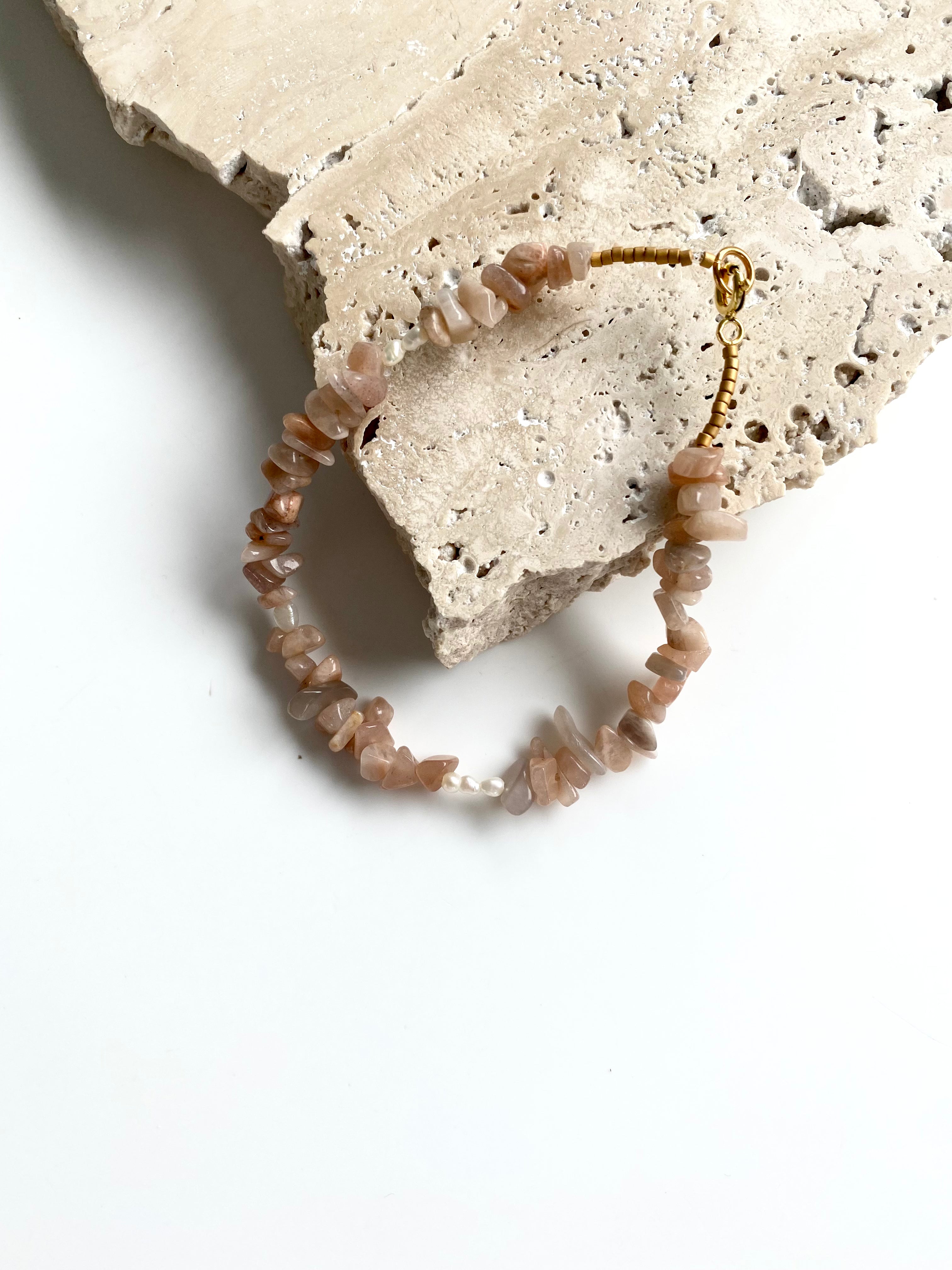 This unique bracelet is made in the semi precious stone sunstone, which have the most amazing combination of rose colour shades, combined with a few small baroque freshwater pearls.
